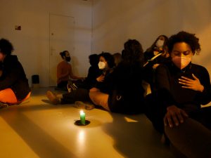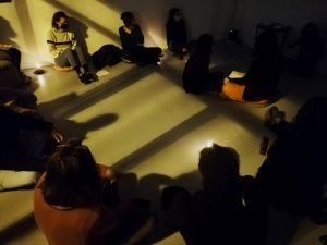 The listening experience begins with a body practice which enables the visitors to connect with themselves, with each other, and with the tobacco. The plant is physically present in the gallery as a scent: some essential tobacco oils are diffused in the exhibition space, in order to affect the psycho-physical states and guide us during the experience. Once the sensitive interconnection is settled, we listen to the chant Tabac Tarab. At the end of the experience the participants can choose to join the tobacco caring network by receiving the caregivers letter and some tobacco seeds.